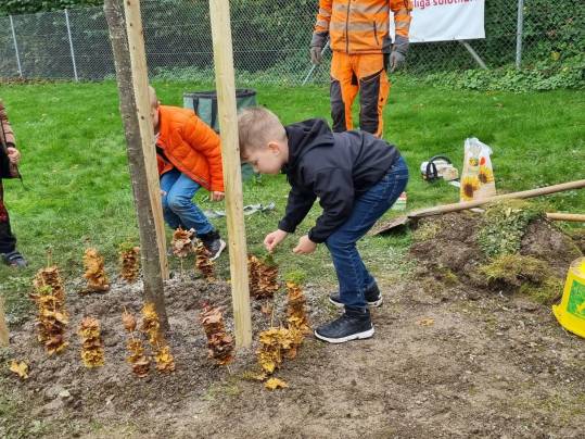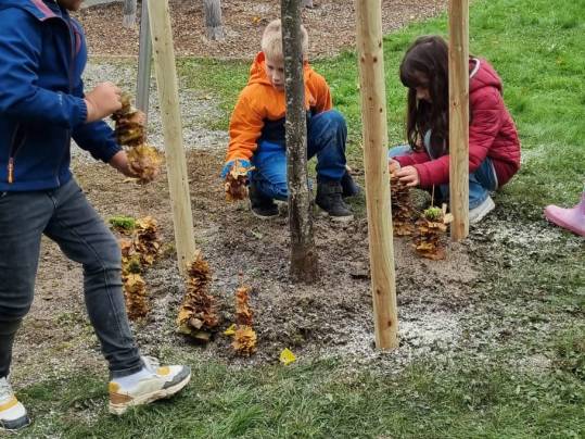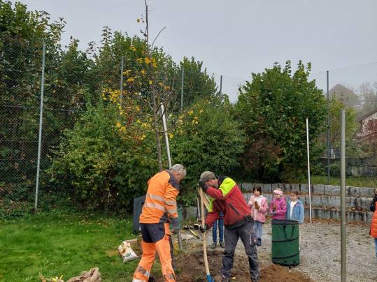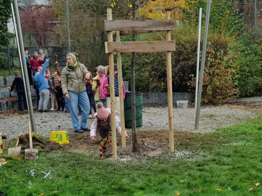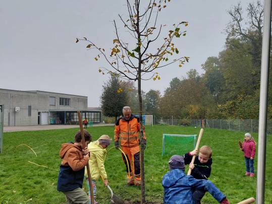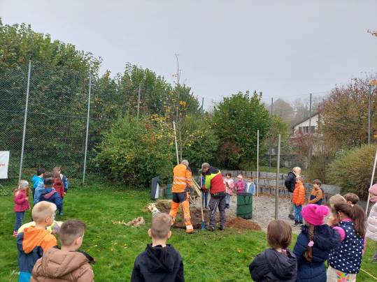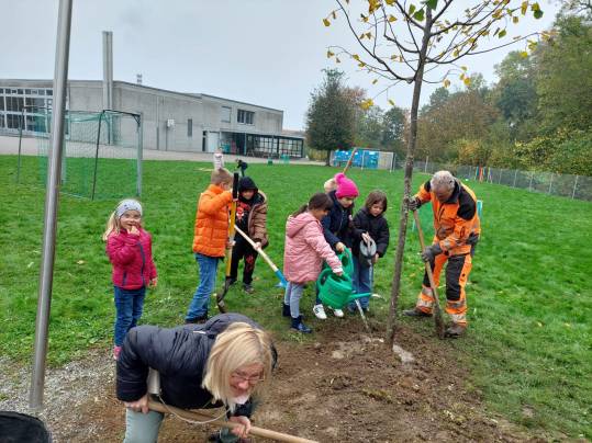 Die 1./2. Klasse durfte heute beim Pflanzen eines neuen Baumes bei der Steinarena dabei sein und mithelfen.