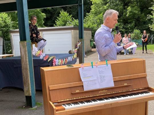 "Hey, hey Frau Saner, mir händ di mega gern" singt es laut aus den Kinderkehlen zur Melodie des Pippi-Langstrumpf-Liedes. Laut Erzählungen der Schulleitung Frau Yvonne Majnaric ein Lied, das oft im Kindergarten zu hören war. Musiziert wurde die Strophe mit dem Kazoo, ein Instrument, das jedes Kind im Kindergarten von Frau Saner überreicht bekommen hat. Natürlich durfte dieses Kazoo bei der Darbietung nicht fehlen. Auch der Gemeindepräsident Herr Fabian Aebi richtete einen grossen Dank an Regula Saner. Mit dem Line Dance und der Tanzmitwirkung auch von einigen Eltern endet die Abschiedsfeier.