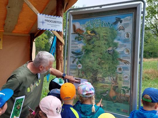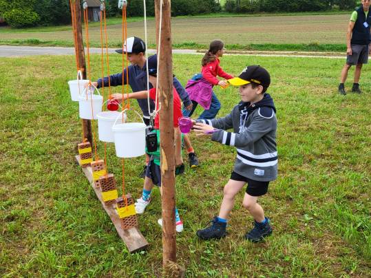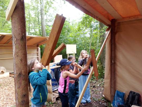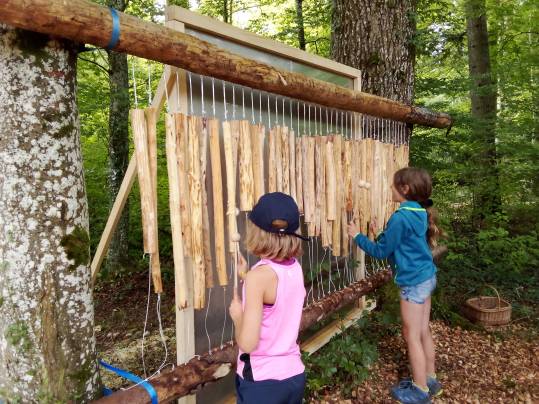 Beeindruckt sind die Kinder auch von den vielen kleinen und grösseren Lebewesen am Posten «Lebensraum Eiche». Mit einer Schnur wird im Kreis ein Netz gespannt, das auf eindrückliche Weise verbildlicht, wie verschiedene Tier- und Pflanzenarten miteinander verbunden und voneinander abhängig sind. Die Eiche bildet dabei das Zentrum, den Lebensraum, den diese Lebewesen brauchen, um existieren und sich fortpflanzen zu können. Die 3./4. Klasse beschäftigt sich derweil mit klingendem Holz und der Bedeutung unseres Trinkwassers.