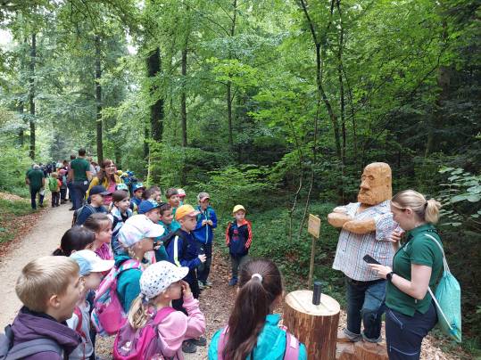 Durch das vorhandene Vorwissen können die Kinder beim entsprechenden Posten «Wald verdient Respekt» mühelos anknüpfen. Verschiedene Akteurinnen und Akteure wie zum Beispiel der Waldbesitzer, die Joggerin, der Jäger, aber auch die Eiche, das Reh und das Wildschwein, kommen an diesem Posten zu Wort. Sie alle beschreiben ihre persönliche Sicht auf den Wald und formulieren ihre Bedürfnisse. Es wird deut-lich, dass der Wald ein Ort ist, an dem alle sich respektvoll begegnen und dem alle gemeinsam Sorge tragen sollen. Die Kinder sind mit hellem Geist dabei und bringen ihre Gedanken und ihre Sichtweise im Gespräch mit dem anwesenden Förster aktiv ein.