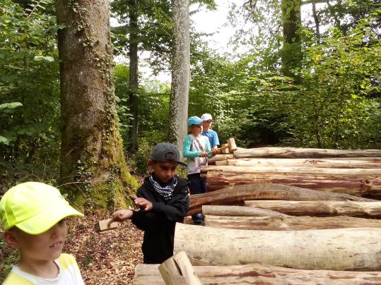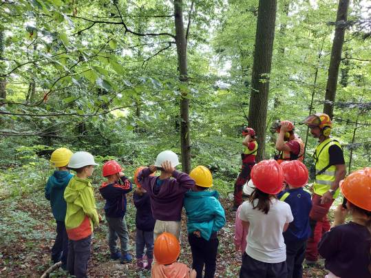 Die 1./2. Klasse hat durch die regelmässigen Waldbesuche im Rahmen des Unter-richts bereits erste Erfahrungen mit der Forstarbeit gesammelt und kann auf dem Rundgang beim Posten «Baumfällen» hautnah erleben, was es bedeutet, wenn ein Baum tatsächlich in nächster Nähe gefällt wird. Die Kids wissen nun genaustens Be-scheid über die Gefahr, in die man sich bringen würde, würde man die Absperrungen und Signale des Forsts nicht ernstnehmen und es wird deutlich, wie wichtig die Waldarbeit und der Rohstoff Holz für uns alle ist.